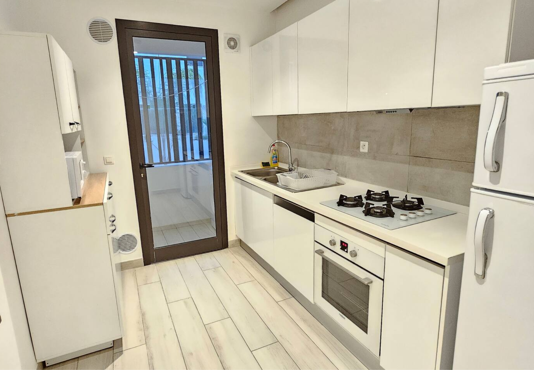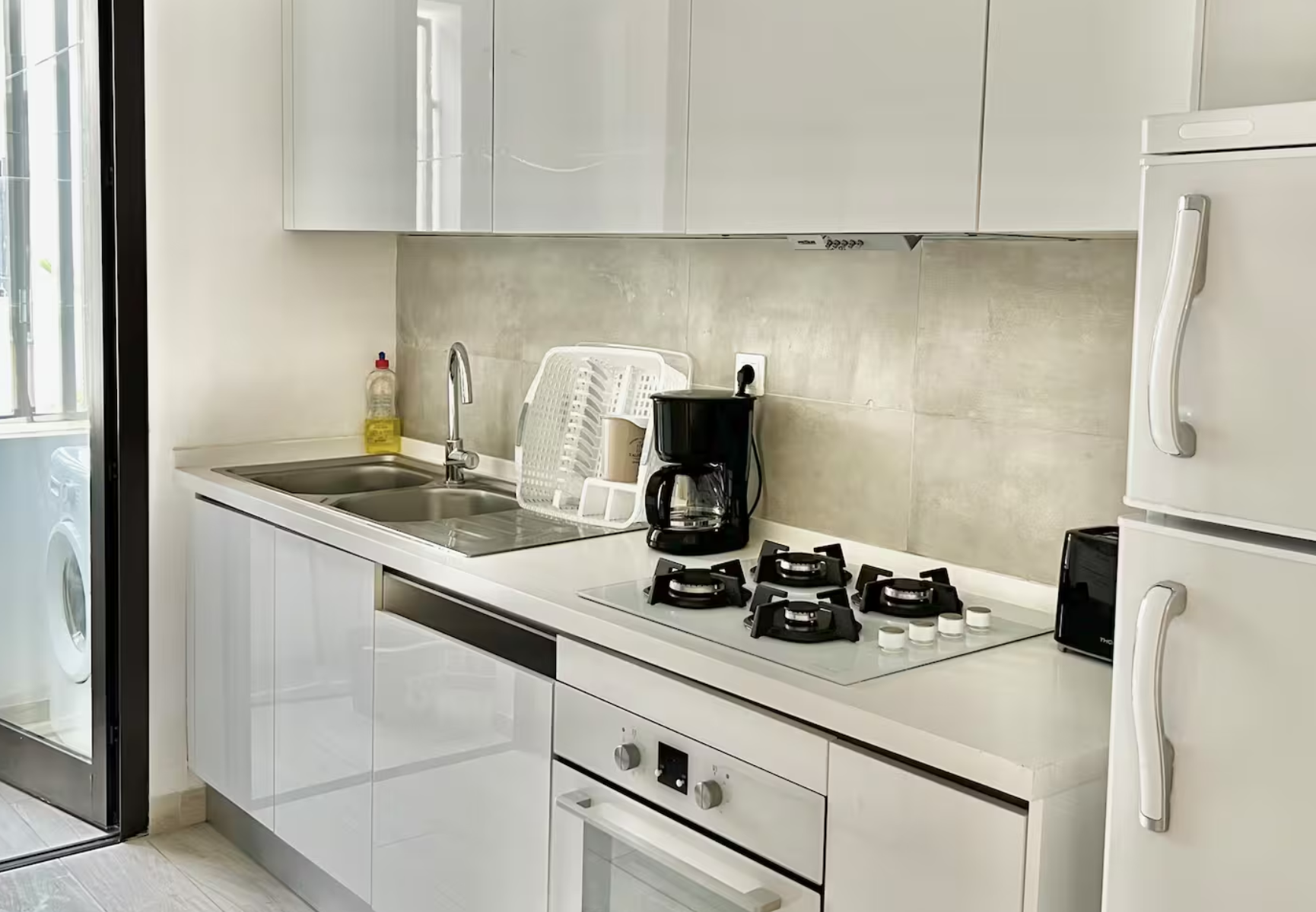 Une cuisine moderne entièrement équipée, dotée de tous les appareils nécessaires (réfrigérateur, four, micro-ondes, machine à café, ustensiles de cuisine) pour un confort optimal au quotidien.