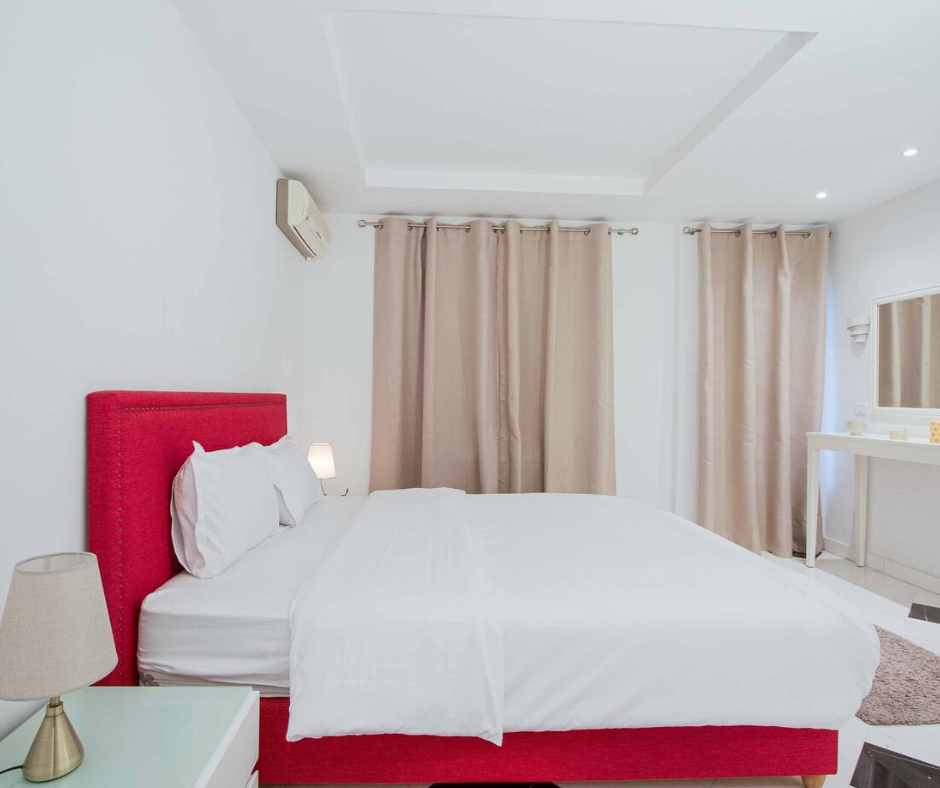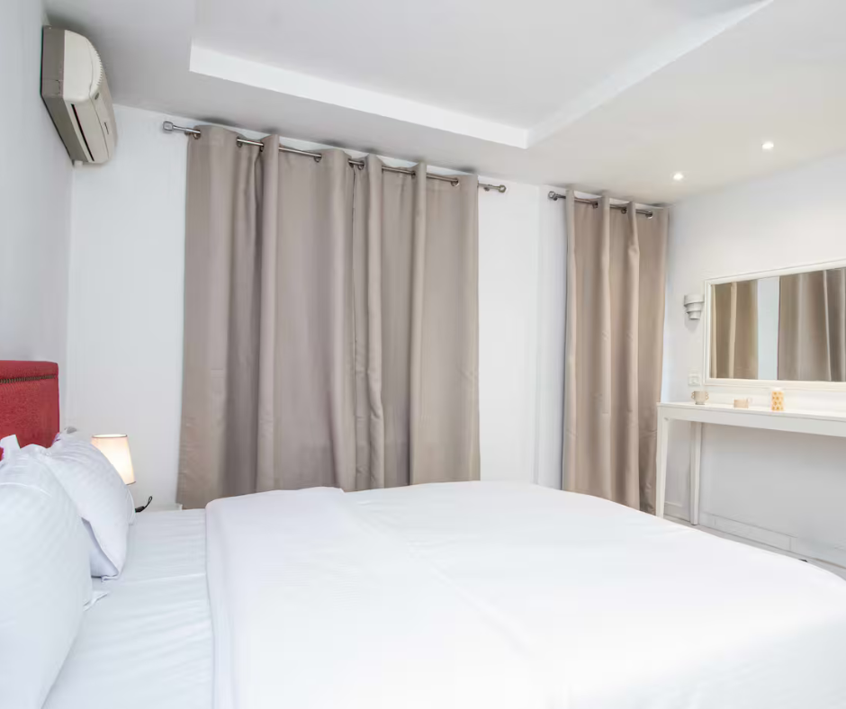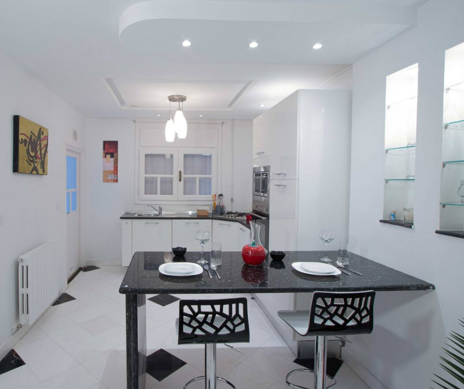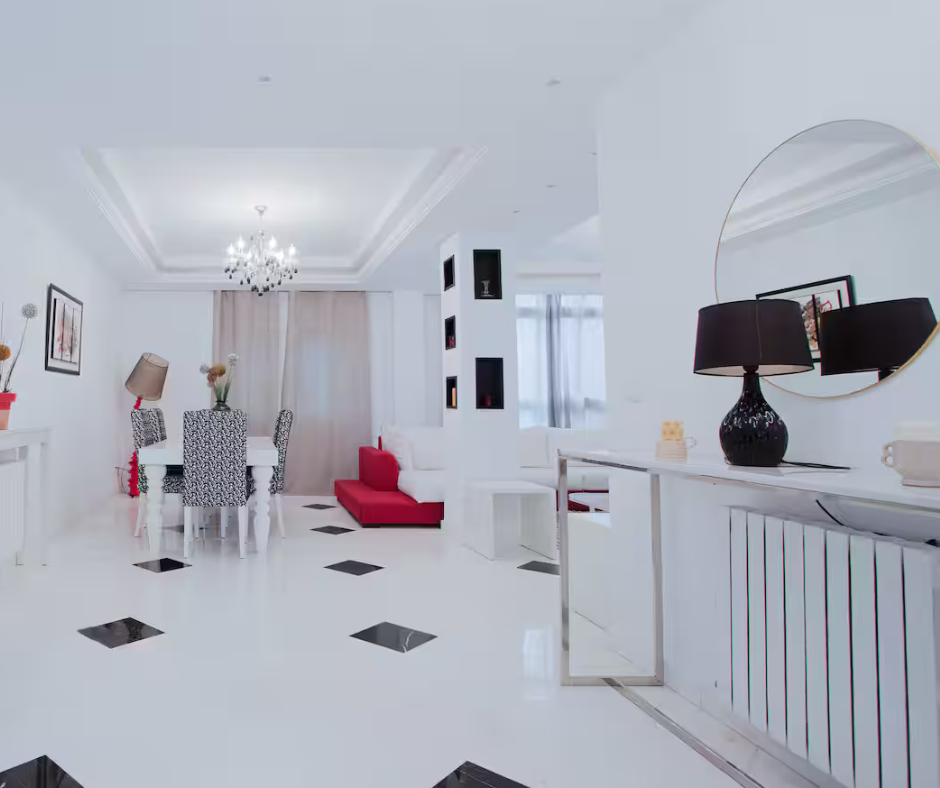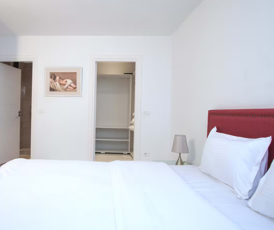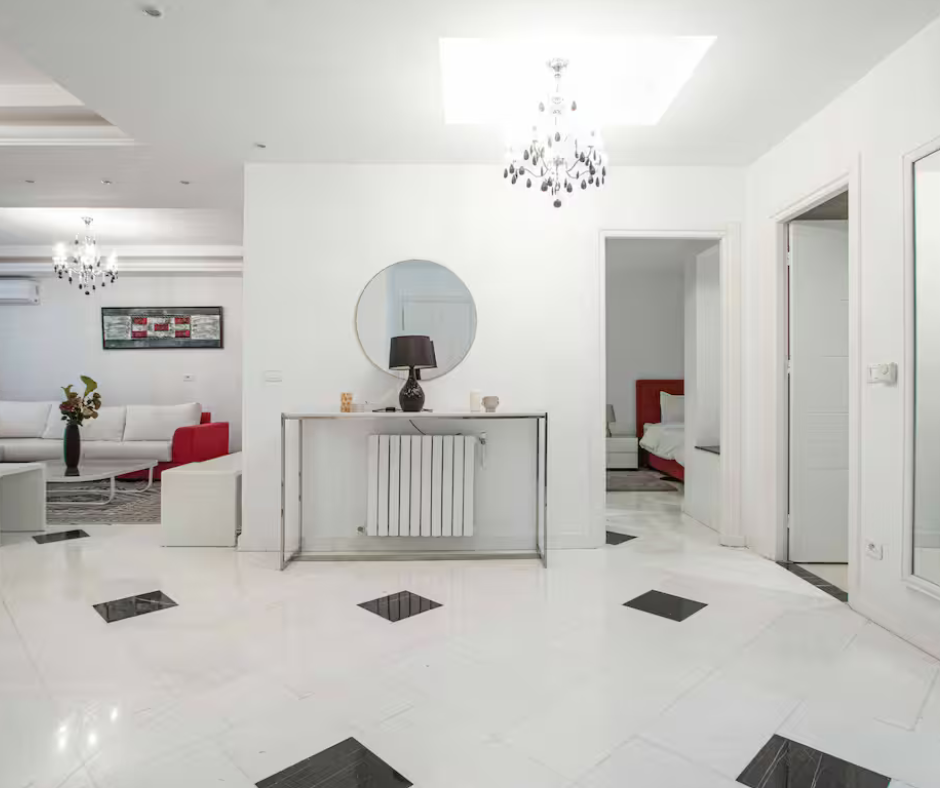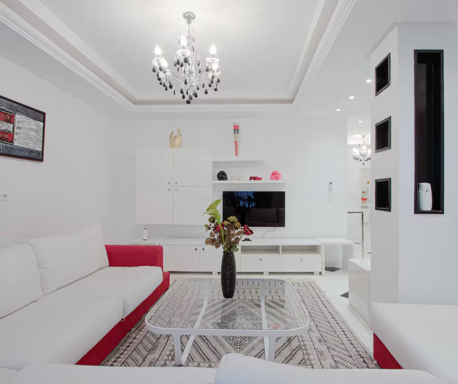 Notre appartement vous invite à une escapade paisible et élégante au cœur du quartier prisé de Lac 1, entre confort moderne et atmosphère chaleureuse.- Le salon, lumineux et décoré avec soin dans des tons blanc et bordeaux, offre un espace cosy avec un grand canapé-lit en L, une télévision à écran plat, et un coin repas convivial, parfait pour se détendre ou partager un repas en toute simplicité.