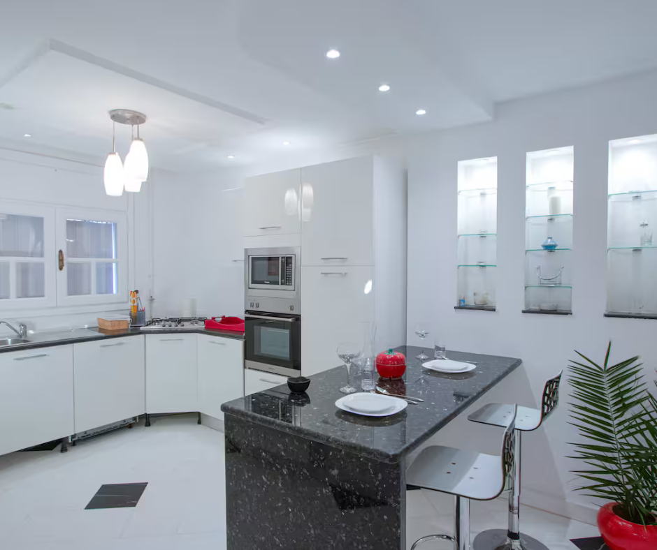– La cuisine séparée est entièrement équipée (four, plaques, micro-ondes, réfrigérateur, vaisselle, ustensiles) et pensée pour allier praticité et élégance, idéale pour préparer vos repas en toute tranquillité.