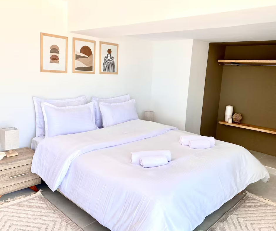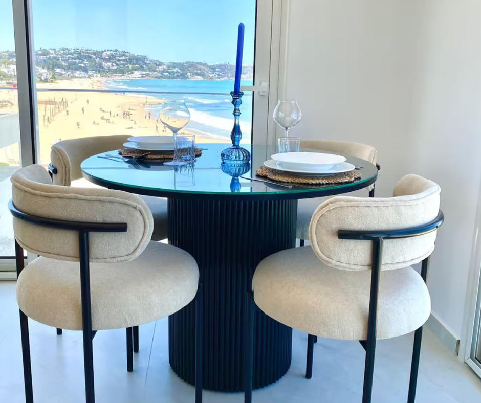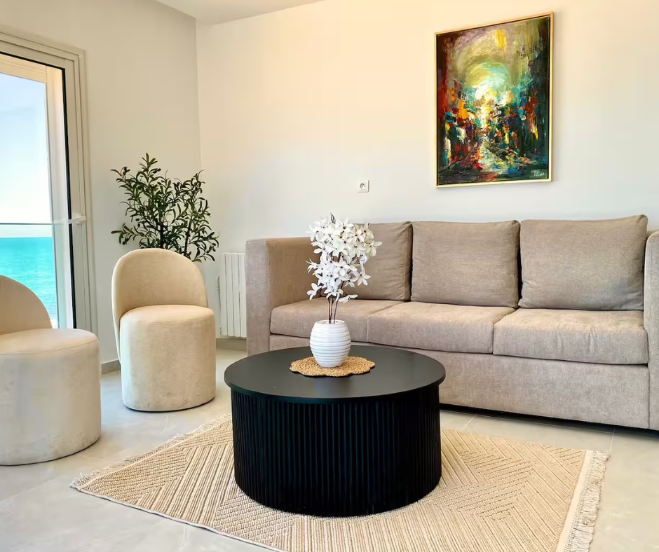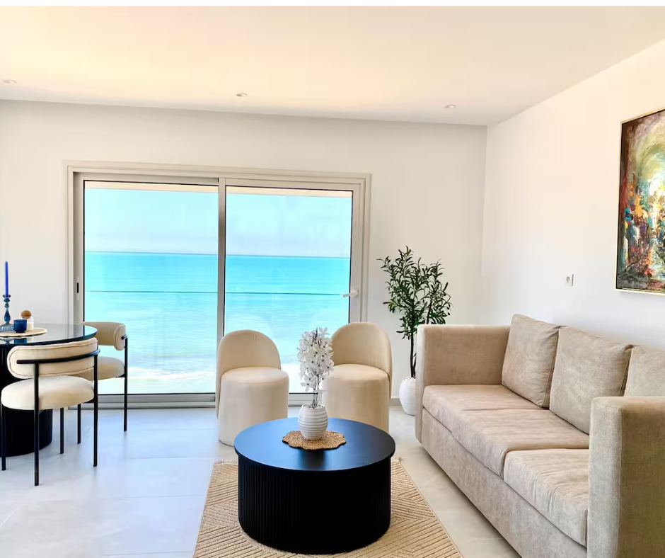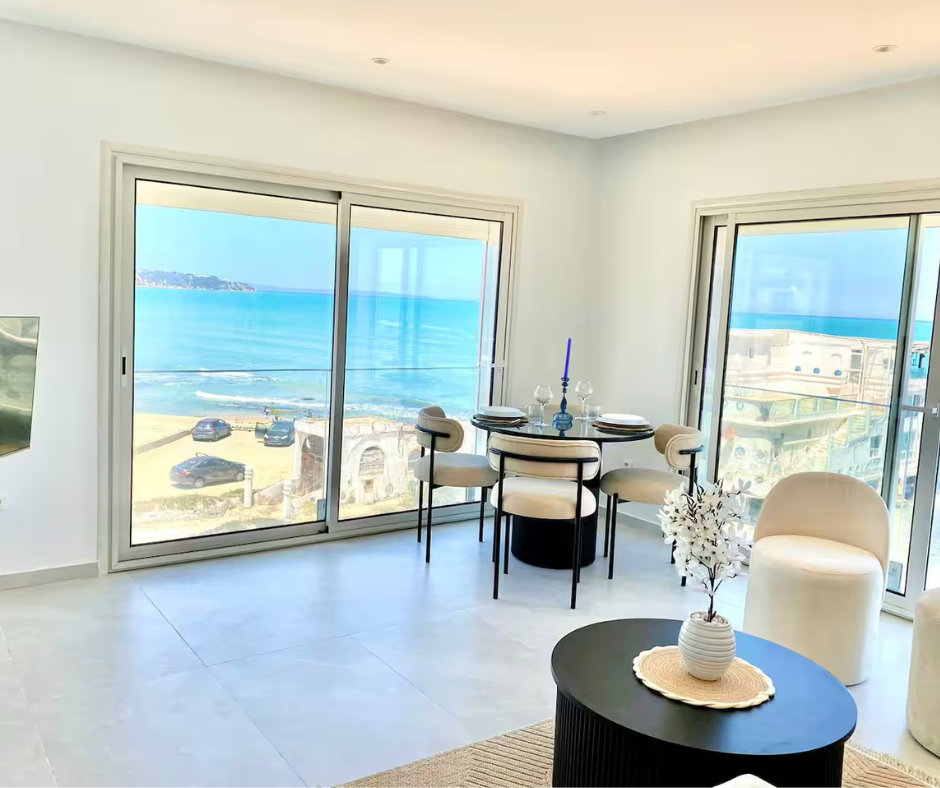 Notre appartement lumineux, décoré dans des tons blancs apaisants, allie confort moderne et charme maritime pour vous offrir un cadre élégant et reposant, idéal pour un séjour les pieds dans l’eau à La Marsa.Il s’ouvre sur une grande terrasse en front de mer, équipée d’un espace repas extérieur avec barbecue, parfait pour partager un repas ou savourer un moment de détente avec une vue directe et imprenable sur la Méditerranée.