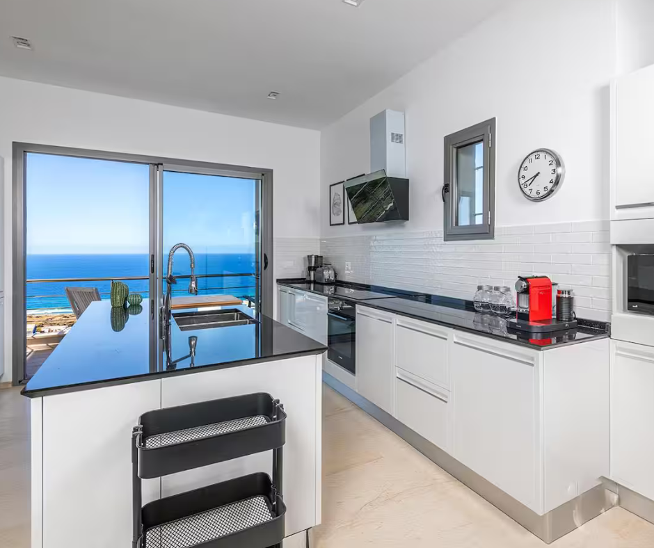 – La cuisine séparée est moderne et entièrement équipée : plaque de cuisson, four, micro-ondes, machine à café, ainsi qu’un espace salle à manger convivial, idéal pour vos repas face à l’horizon marin.