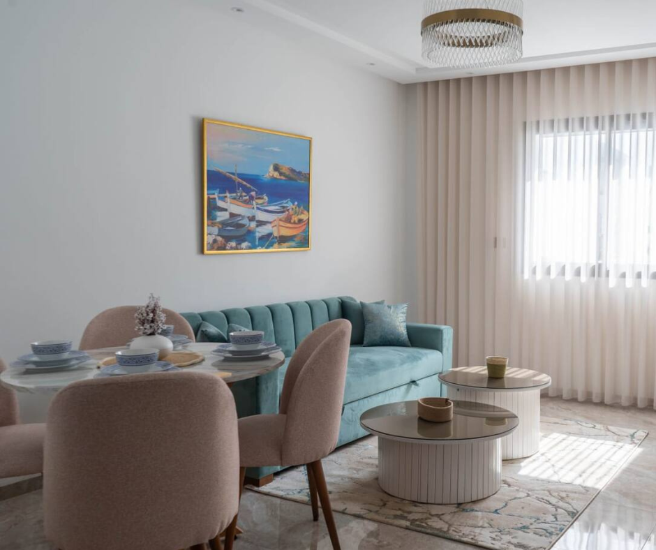 Séjournez dans cet appartement élégant et entièrement équipé à Aïn Zaghouan, parfait pour un couple ou un petit groupe. Vous y trouverez un salon confortable avec canapé-lit, une chambre douillette avec lit double et un coin repas avec table à manger. La cuisine est moderne et fonctionnelle, équipée d’un four, d’une machine à café et d’un lave-linge. Pour votre confort, un fer à repasser, un sèche-cheveux et des verres à vin sont également disponibles. L’espace est conçu pour allier détente et praticité, vous offrant un cadre agréable pour découvrir Tunis, Carthage, Sidi Bou Saïd et La Marsa tout en profitant d’un séjour confortable et serein.